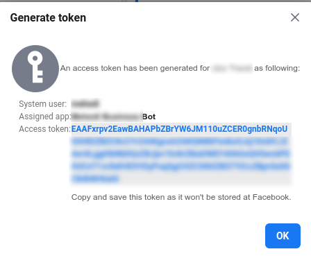 Then a list of available permission will appear. From the list, you have to select Business management,Catalog management,WhatsApp business messaging, and WhatsApp business management. Now click on the Generate token button.