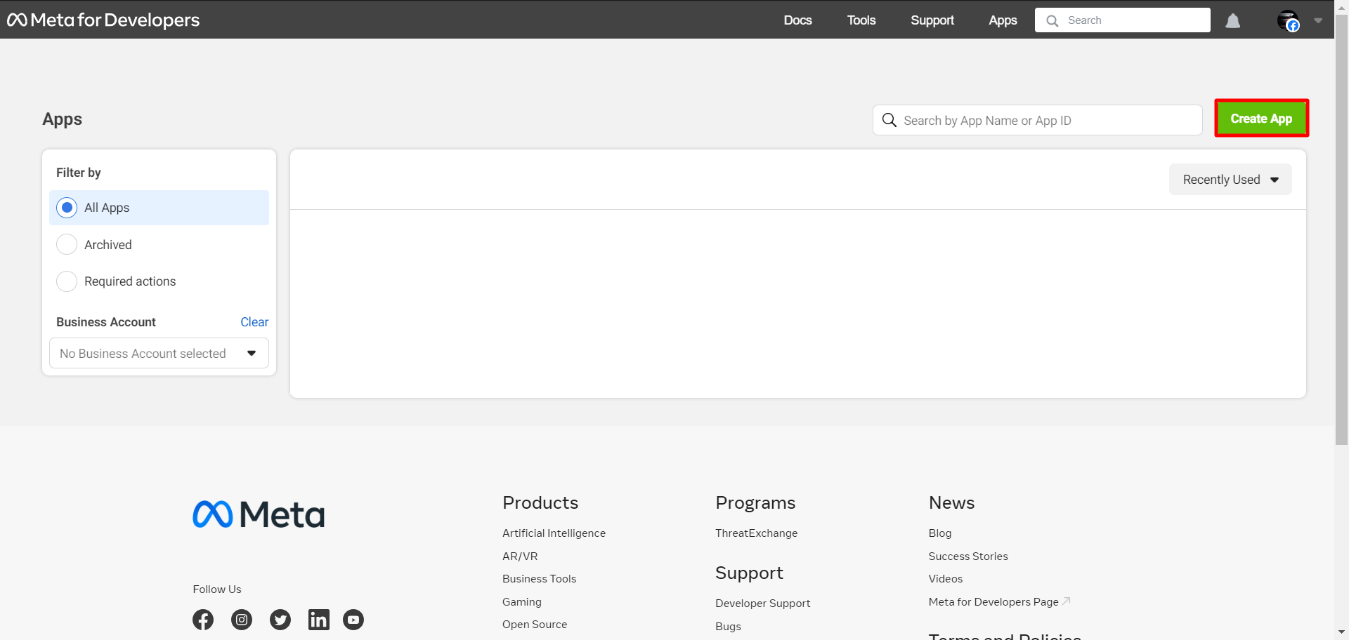 Instantly, a page will appear with a Create App button and all your predefined apps.